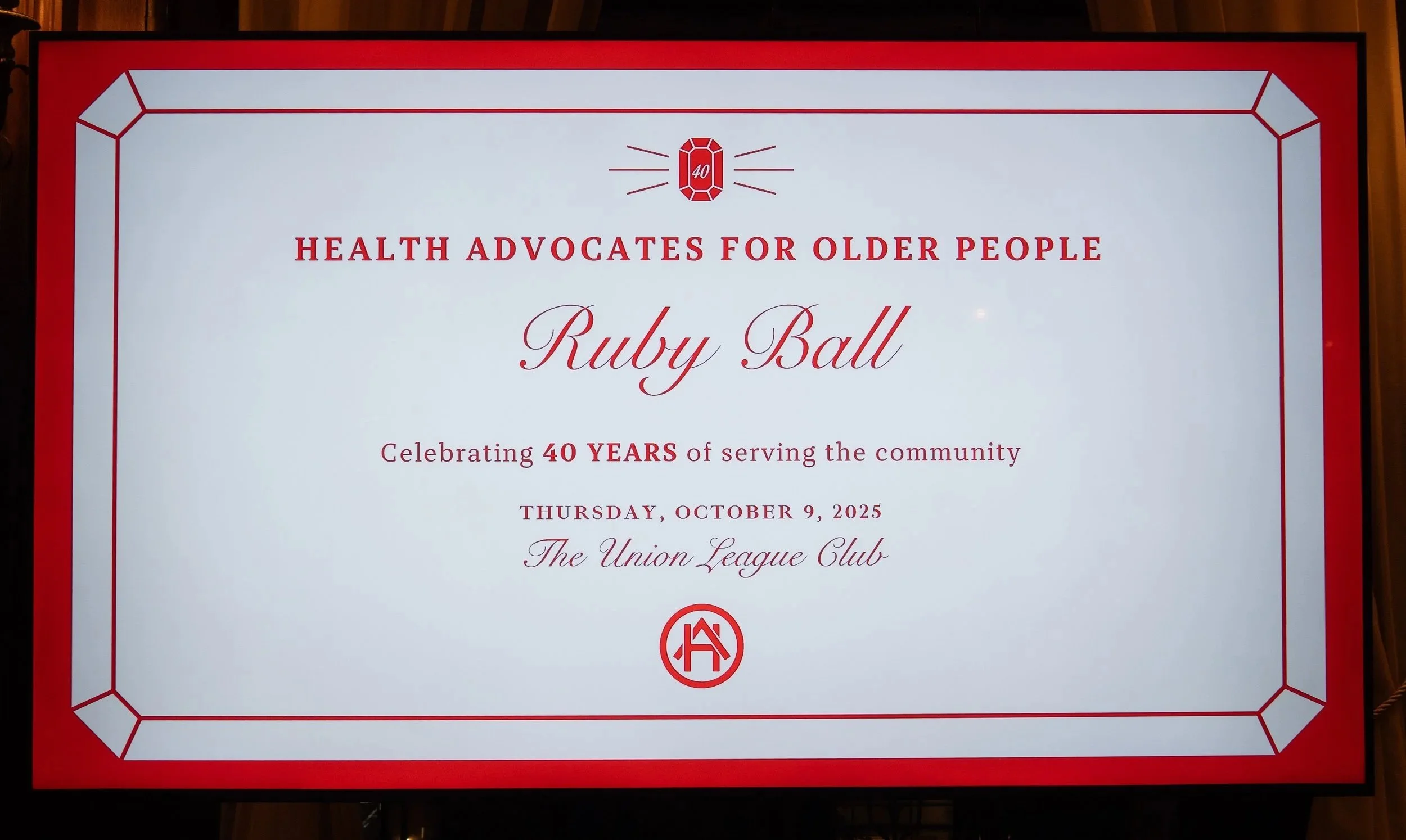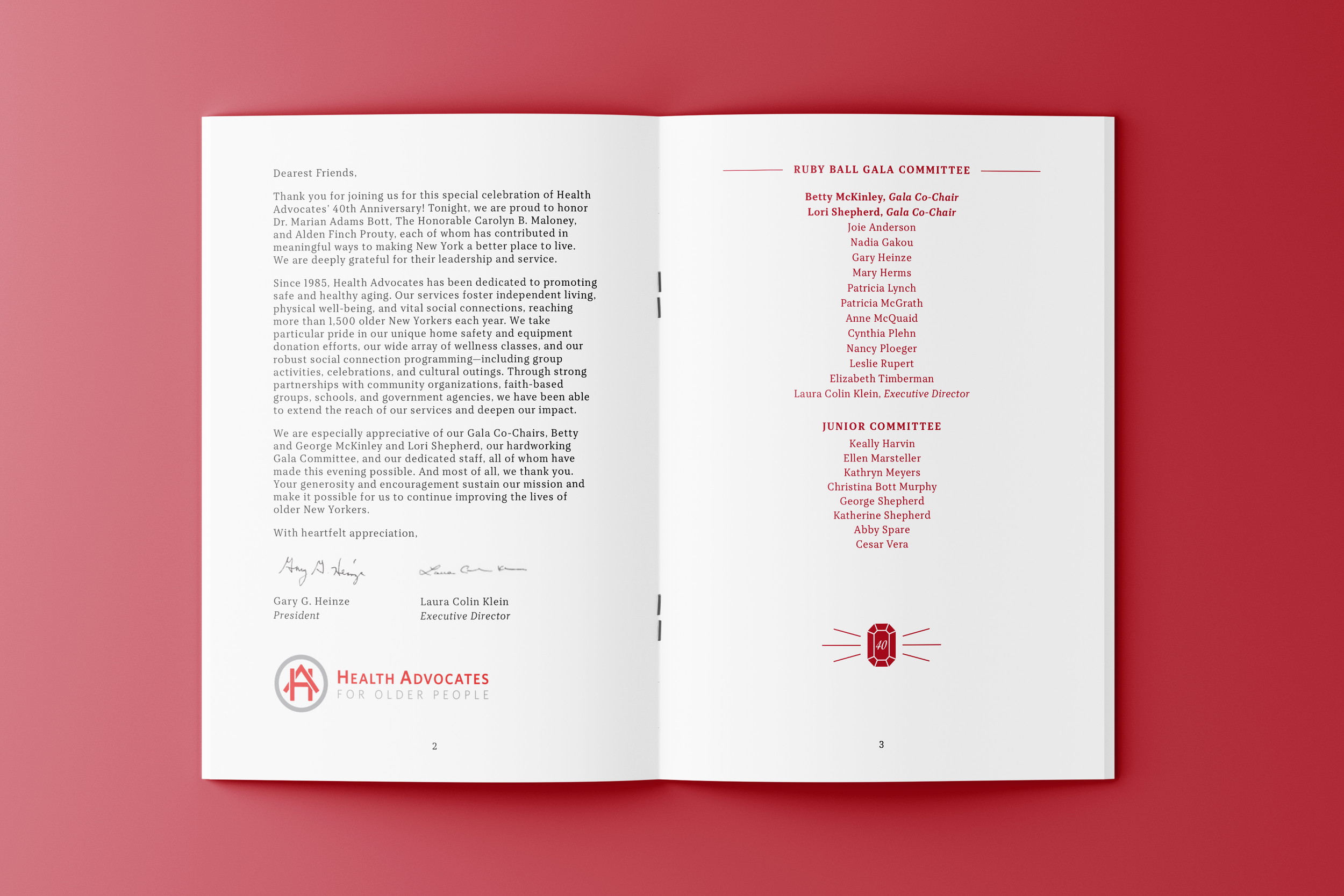 Concept, branding, and print and digital assets for the Health Advocates for Older People Ruby Ball